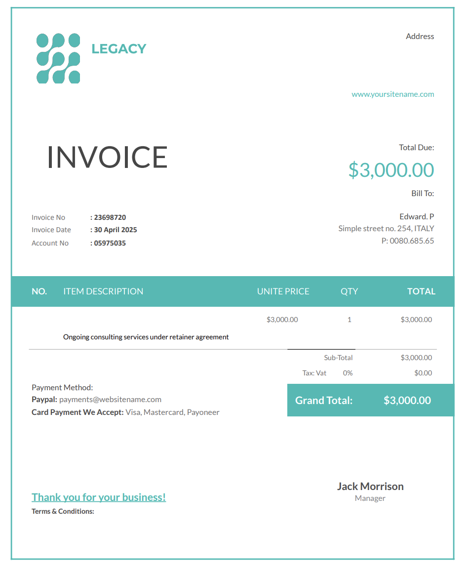 You should also keep the description accurate and concise. Your consultant retainer invoice should state that the fee covers ongoing consulting services or availability during the billing period. Avoid listing tasks, meetings, or emails unless your agreement explicitly requires it.