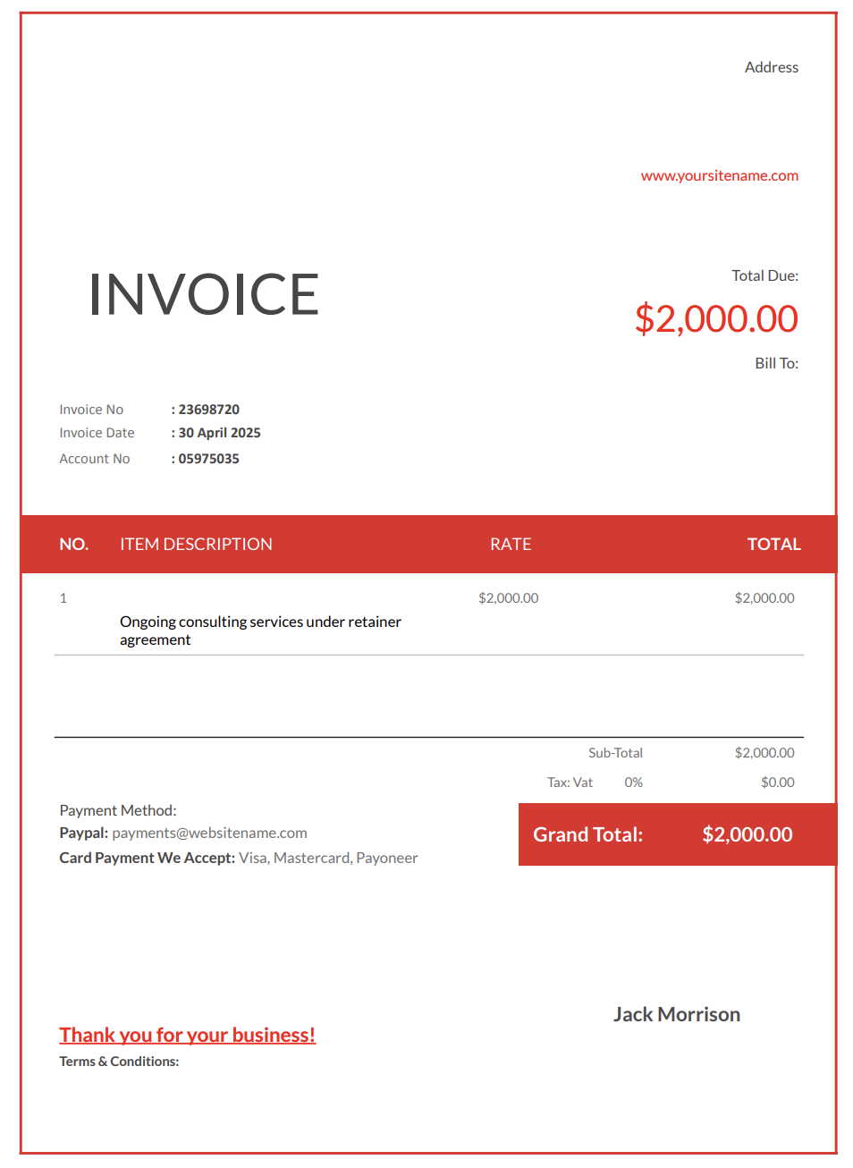 Independent consultants typically benefit from simple retainer invoices. Most clients only need to confirm: